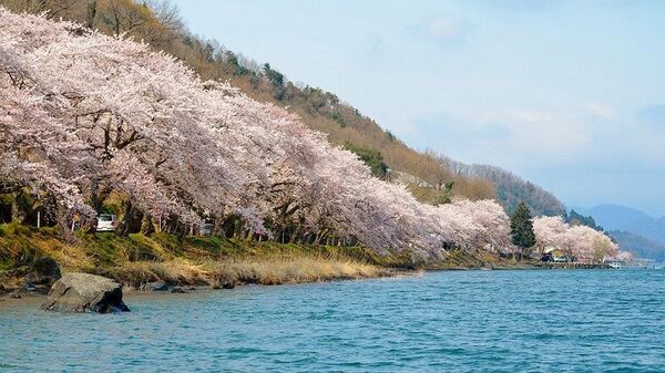 Kaizu Osaki, located in Takashima City in northwestern Lake Biwa, is one of Japan’s Top 100 Cherry Blossom Spots. About 800 cherry trees (Somei-Yoshino) bloom along a scenic 4-kilometer stretch, forming a breathtaking tunnel of pink beside the lake.